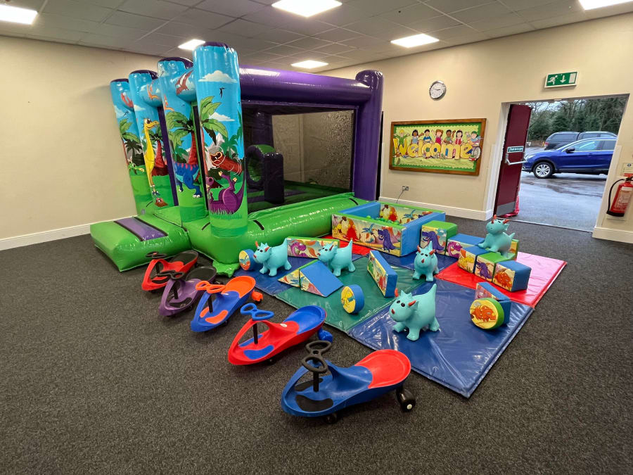 A superb selection of an indoor activity bouncy castle, soft play set up, didi cars and dinosaur hoppers.
