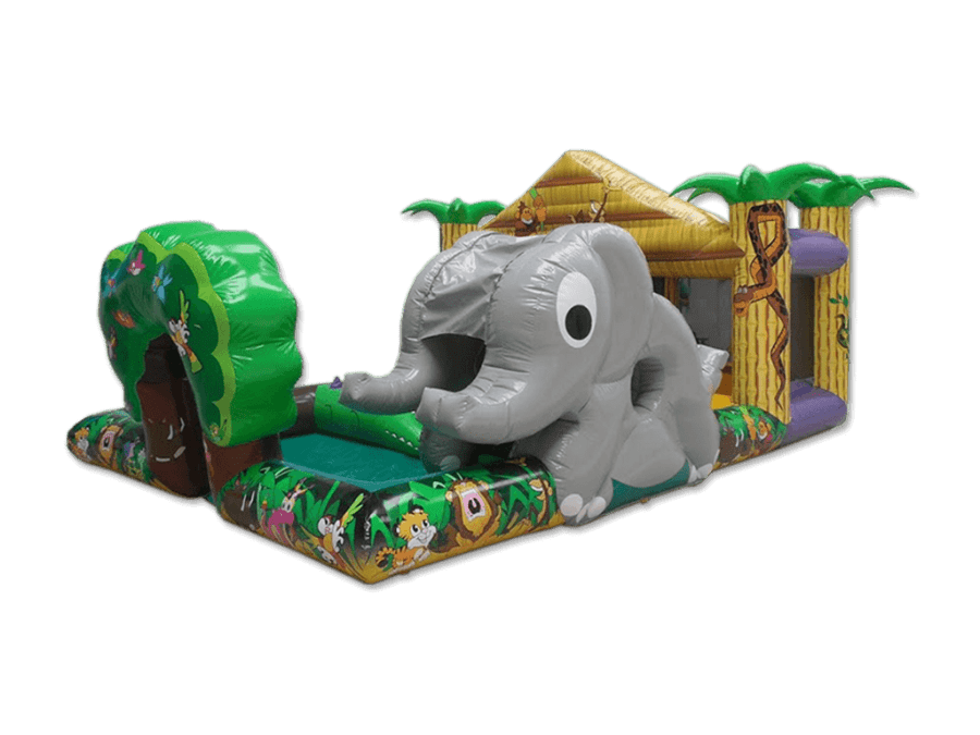 Included in this jungle themed product is a bouncing area, air juggler, mini slide, and a ball pond, all featuring vibrant and exciting digital jungle imagery. πŸŒΏπŸ’ Your little ones will be immersed in a world of wild fun! The inflatable play park is a fantastic piece of equipment and will entertain lots of children at your event. The inflatable is decorated in huge detail with digitally printed artwork of a jungle theme including cartoon snakes, tigers, monkeys, lions and more. The inflatable slide section has been designed and decorated to look like an elephant, which is fantastic. It really is a stunning piece of kit and a real centre piece for indoor jungle themed parties and events.