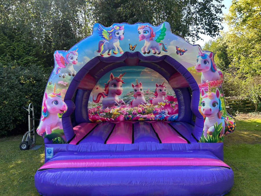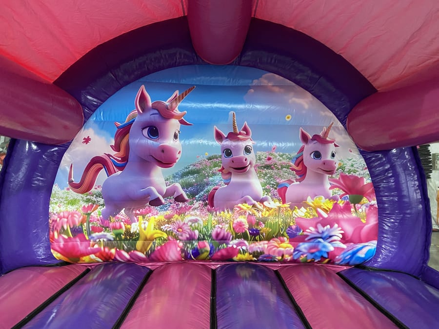 The back wall showcases high-quality digital artwork of unicorns, making it look as though they are leaping into the bouncing area, while the curved front entrance adds even more whimsical imagery to delight little ones.