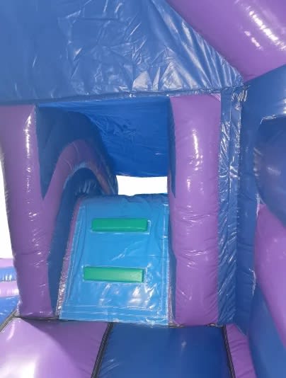 The Blue & Purple Front Slide Combo features a spacious bouncy castle area where kids can jump, bounce, and play to their heart's content. The attached inflatable front-facing slide adds an extra element of thrill and excitement. With its vibrant blue and purple color scheme, this combo unit is sure to capture the attention of all party-goers. A sewn in, fitted sun / shower cover offers protection from the top of the unit as well as a front visor which offers protection from sun glare on sunny Summer days.