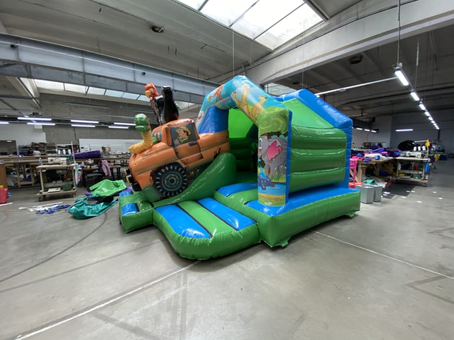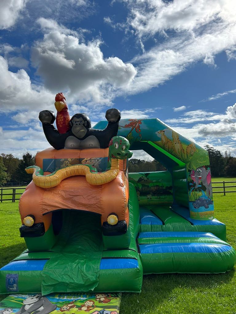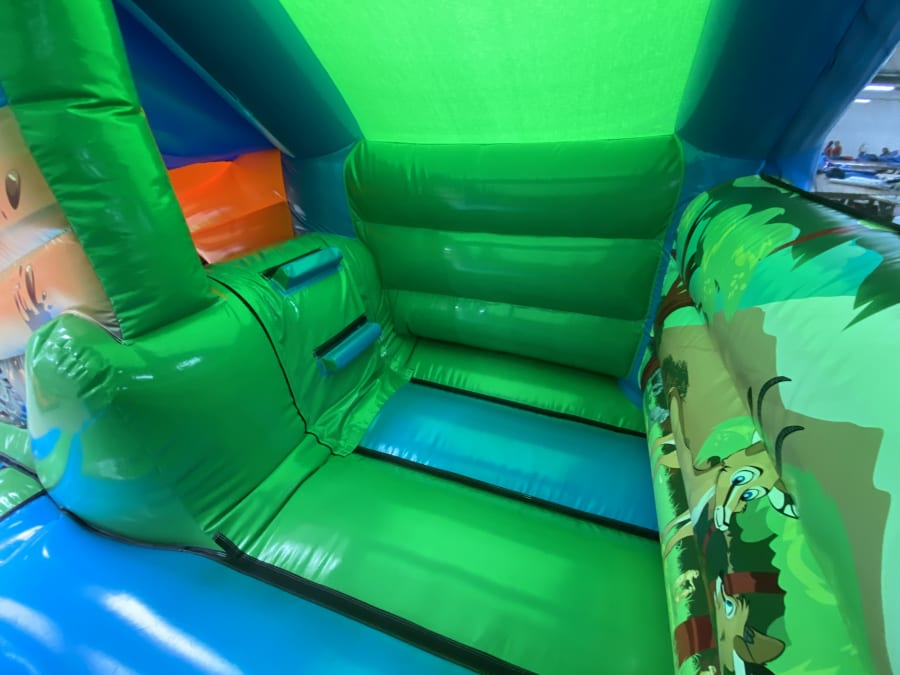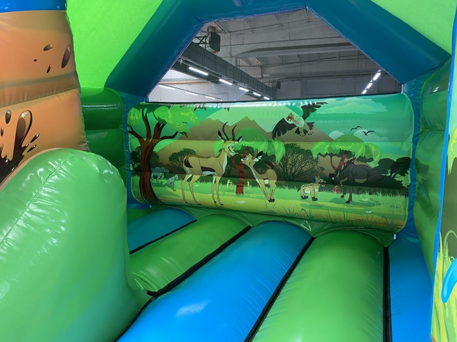 The top beam and side pillars along with the back wall of the inflatable are also decorated with crisp digitally printed generic jungle / safari artwork featuring more animals such as elephants and hippos.