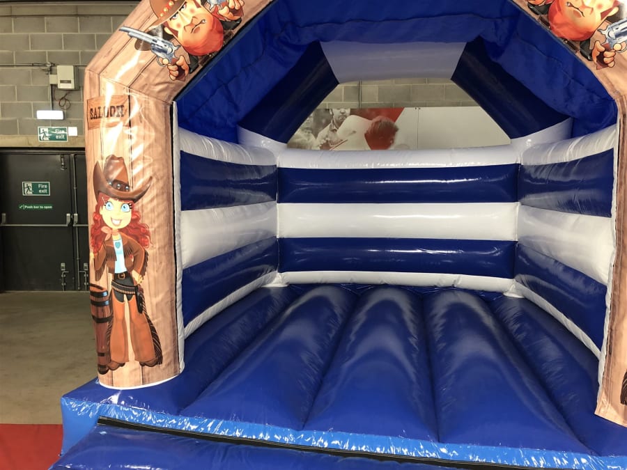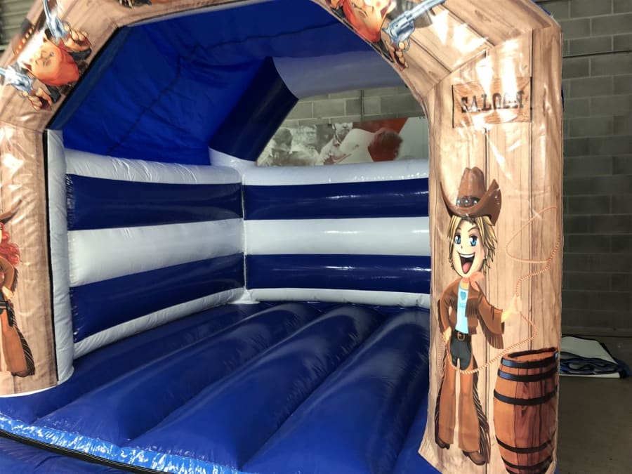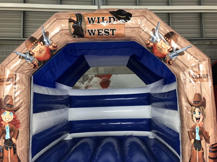 The bouncy castle has been designed, manufactured and tested right here in the UK to ensure that it's built and maintained to the UK / EU safety standard (BS EN 14960:2013). Across the top beam and side pillars of the bouncy castle is some fantastic digitally printed artwork in the Wild West saloon theme featuring generic cowgirls and cowboys with pistols and the 'Wild West' slogan at the top.
