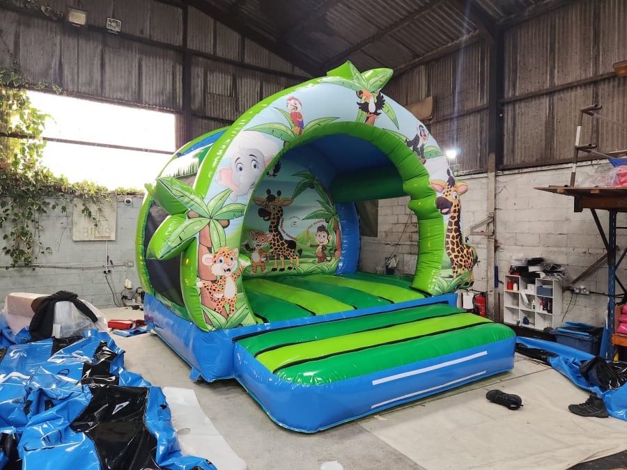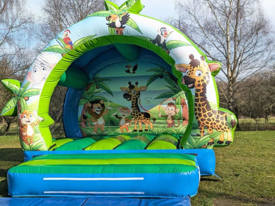 This bouncy castle unit has been built with a curved design which is a welcome change on the traditional bouncy castle styles which tend to be A frame or H frame shape in general. The front facing curve features pop out contours which add a superb design element to the inflatable unit. All of this curve area is decorated with crisp, digital jungle themed imagery which is kid friendly including animals such as giraffes, elephants and cheetahs.