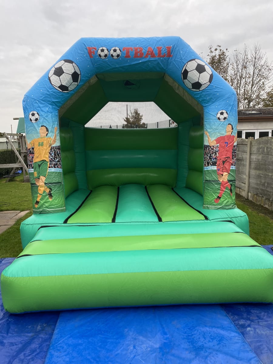 This bouncy castle has added velcro artwork on the front pillars and top beam of the inflatable of football related artwork.