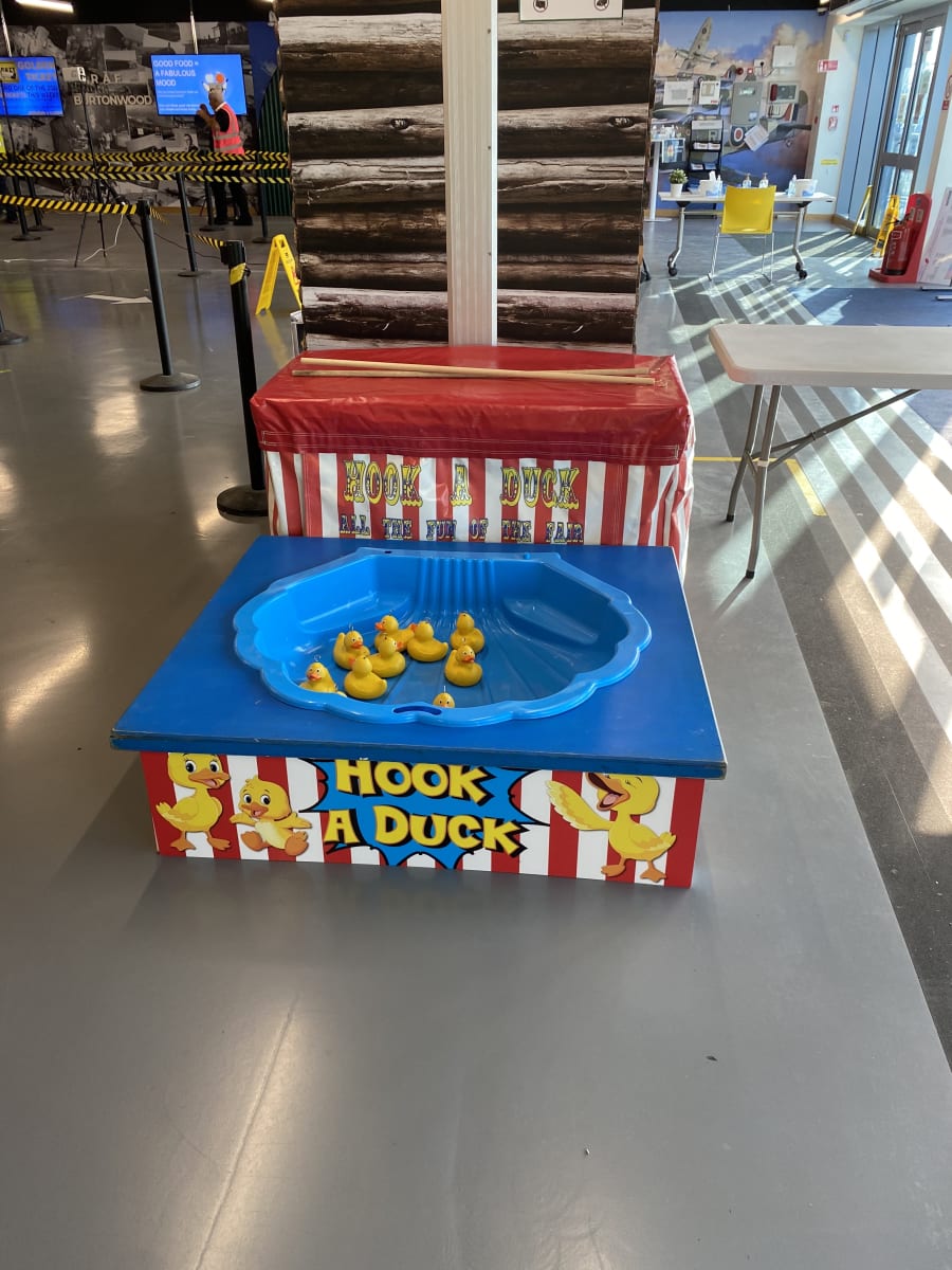 This traditional hook-a-duck side stall is ideal for a fun event and features a wonderful red and white candy stripe design with cartoon mini yellow ducks.