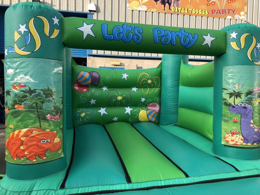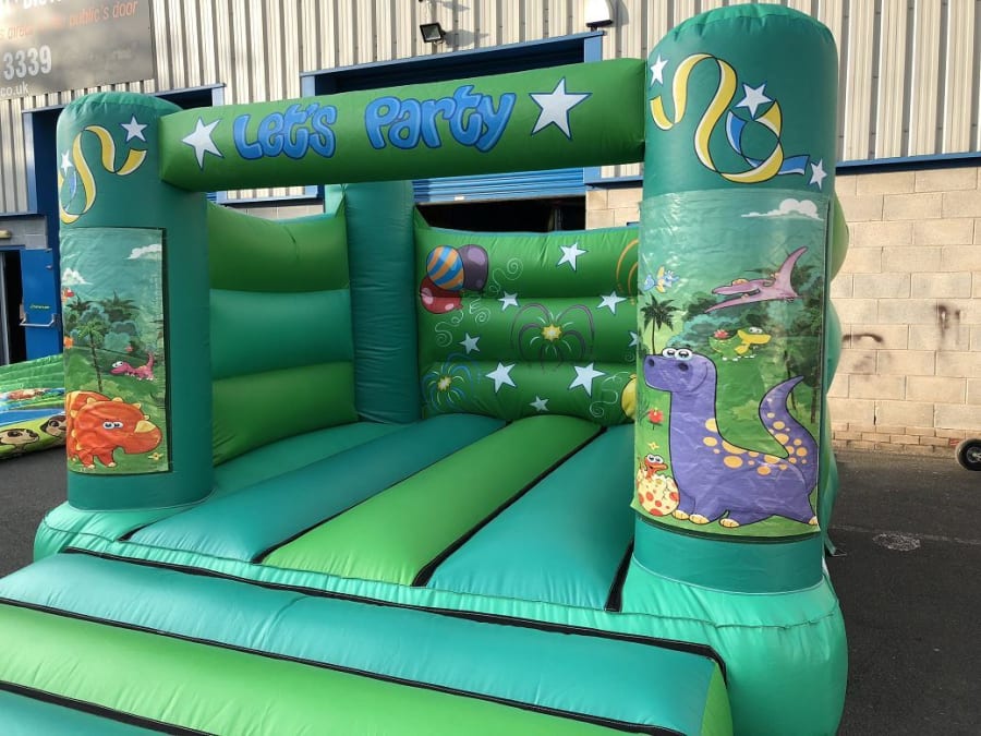 Manufactured in the UK, this bouncy castle conforms to the inflatable safety standard applicable to the UK and Europe (BS EN 14960:2013). Designed with green material throughout, this indoor bouncy castle is ideally suited for the dinosaur theme. The back wall of the bouncy castle features hand painted artwork of general party items such as balloons, streamers, fireworks etc, this artwork continues across the top beam and side pillars of the inflatable. Also on the front pillars of the bouncy castle you will find awesome digitally printed artwork of dinosaurs and other prehistoric items as shown in the product listing photos.