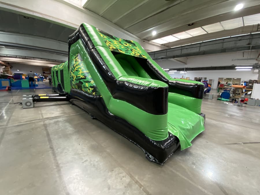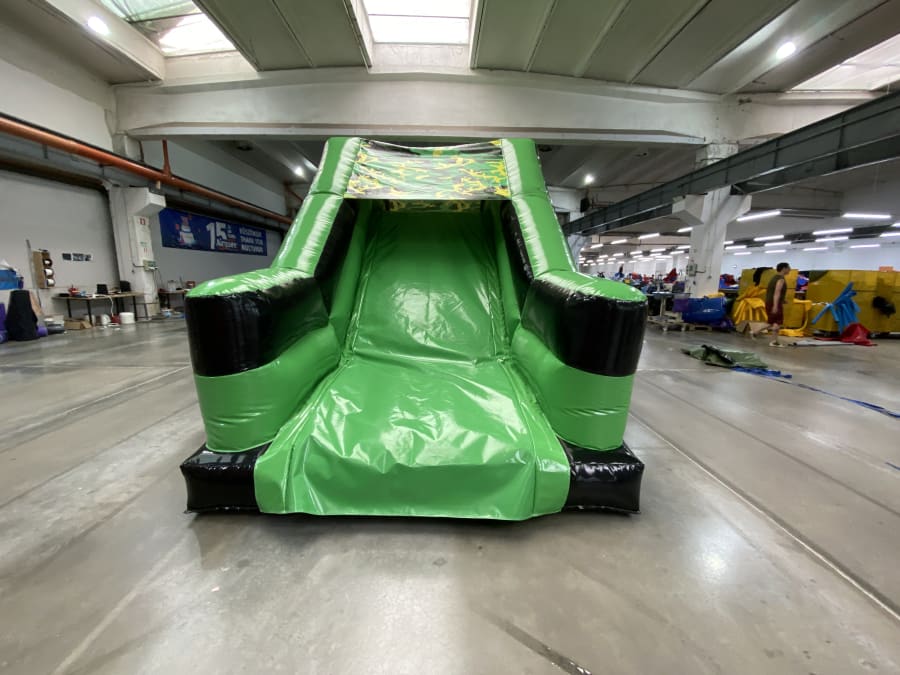 This inflatable obstacle course is wonderfully colour co-ordinated to the theme with army style camouflage colours used throughout. There is 'biff'n'bash' pop ups and obstacles at the start of the inflatable followed by an 'up and over' style slide at the end which has a platform of 7.71ft tall so this is the height at which the user sits when starting to slide.