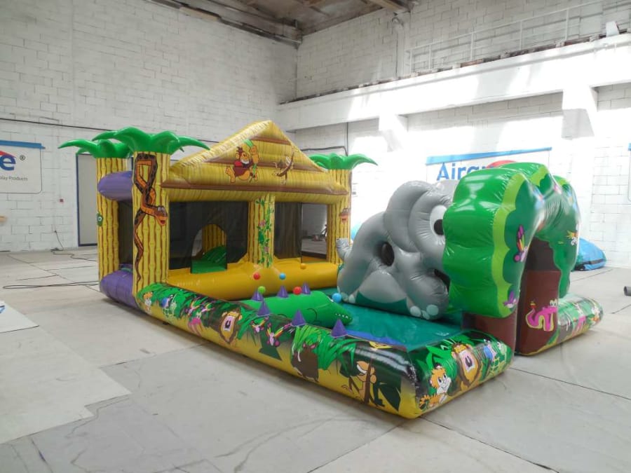 Included in this jungle themed product is a bouncing area, air juggler, mini slide, and a ball pond, all featuring vibrant and exciting digital jungle imagery. πΏπ Your little ones will be immersed in a world of wild fun! The inflatable play park is a fantastic piece of equipment and will entertain lots of children at your event. The inflatable is decorated in huge detail with digitally printed artwork of a jungle theme including cartoon snakes, tigers, monkeys, lions and more. The inflatable slide section has been designed and decorated to look like an elephant, which is fantastic. It really is a stunning piece of kit and a real centre piece for indoor jungle themed parties and events.