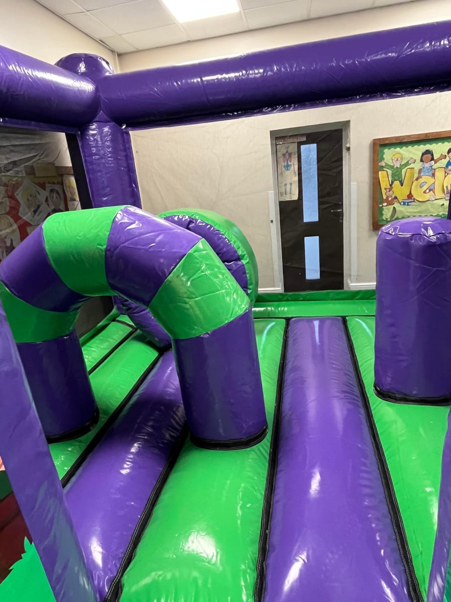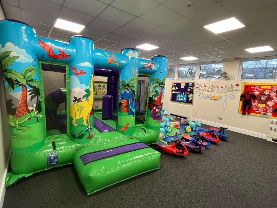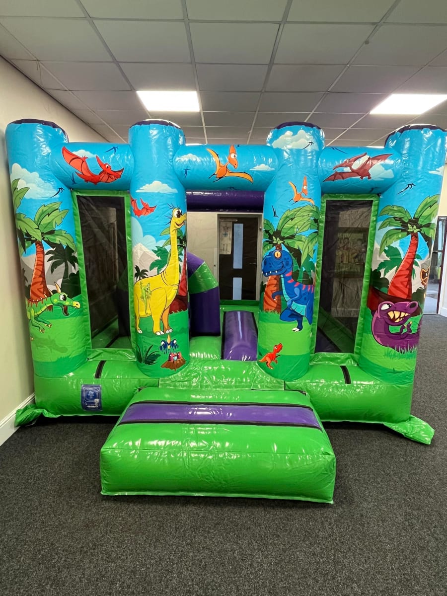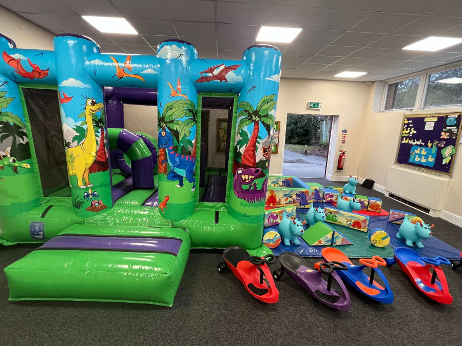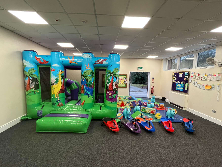 A superb selection of an indoor activity bouncy castle, soft play set up, didi cars and dinosaur hoppers.